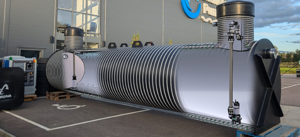 Beställare: Åtvidaberg Vatten Objekt: Stor PE Tank för dricksvatten. Installerades inuti den befintliga utdömda betongbrunnen. Samtliga anslutningar och flänsar levererades måttbeställt för inkoppling på det befintliga systemet.